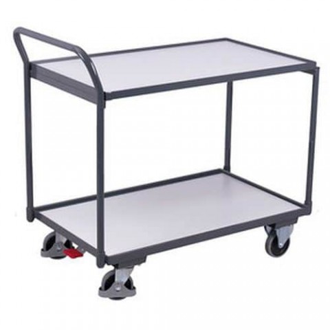 Antistatické vozíky se dvěma policemi vhodné do prostor, kde je nutné předcházet elektrickým výbojům. Police vyrobené z MDF desek jsou zasazené do kovových rámů vozíku. Mobilitu zajišťují čtyři kola s valivými kuličkovými ložisky, z nichž dvě jsou pevná a dvě otočná s brzdou Easy Stop a ochrannými kryty.Antistatické policové vozíky s madlem, do 250 kg, 2 police