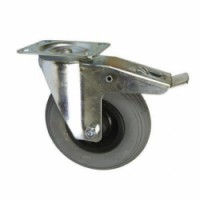 Otočné bantamové kolo s brzdou, s šedou obručí a šedým plastovým diskem. Šetrné vůči podlaze, nízký odpor při rozjezdu. typ kola: otočné s brzdou materiál kola: guma průměr kola: 200 mm šířka kola: 50 mm nosnost: 70 kg způsob uchycení: vidlice s přírubou výška kola s vidlicí: 244 mm vyložení kola: 50 mm ložiska: valivá (jehlová) brzda otáčení, povrchová úprava pozinkováním, dvouřadý kuličkový věnec ve vidlicové hlavěBantamové kolo s přírubou, průměr 200 mm, otočné s brzdou, valivé ložisko