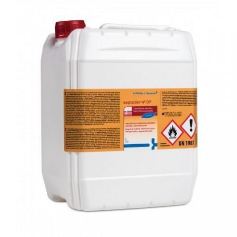 Barvená tekutá alkoholová dezinfekce pro operační pole Septoderm. Vhodný pro dezinfekci pokožky před operačními zákroky, vpichy a malými zákroky porušujícími integritu kůže. Neobsahuje jód. Obsahuje barvivo k označní operačního pole. Dobrá snášenlivost s pokožkou. Rychlá a dlouhotrvající účinnost. Dezinfikuje, čistí a odmašťuje pokožku. Složení (účinné látky ve 100 g přípravku) - Ethanol 45 g, Propan-2-ol 30 g, KAS 0,5 g. Použití: Dezinfekce kůže před injekcemi a odběry 15 s. Dezinfekce kůže před punkcemi kloubů, dezinfekce operačního pole a postoperativní dezinfekce kůže 1 min. Dezinfekce kůže s vyšším výskytem mazových žláz 2 min. A - baktericidní ? (B) - virucidní na BVDV / Vaccini, T- tuberkulocidní (M. terrae) ? M - mykoaktericidní (M. avium, M. terrae) / (V) - levurocidní (C. albicans) / ROTA - Rotavirus ? H - Herpesvirus.Barevná alkoholová dezinfekce pro operační pole Septoderm 5l OP