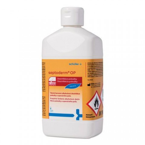 Barvená tekutá alkoholová dezinfekce pro operační pole Septoderm. Vhodný pro dezinfekci pokožky před operačními zákroky, vpichy a malými zákroky porušujícími integritu kůže. Neobsahuje jód. Obsahuje barvivo k označní operačního pole. Dobrá snášenlivost s pokožkou. Rychlá a dlouhotrvající účinnost. Dezinfikuje, čistí a odmašťuje pokožku. Složení (účinné látky ve 100 g přípravku) - Ethanol 45 g, Propan-2-ol 30 g, KAS 0,5 g. Použití: Dezinfekce kůže před injekcemi a odběry 15 s. Dezinfekce kůže před punkcemi kloubů, dezinfekce operačního pole a postoperativní dezinfekce kůže 1 min. Dezinfekce kůže s vyšším výskytem mazových žláz 2 min. A - baktericidní ? (B) - virucidní na BVDV / Vaccini, T- tuberkulocidní (M. terrae) ? M - mykoaktericidní (M. avium, M. terrae) / (V) - levurocidní (C. albicans) / ROTA - Rotavirus ? H - Herpesvirus.Barvená tekutá alkoholová dezinfekce pro OP Septoderm - 500ml