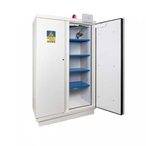 Bezpečnostní skříň pro skladování lithiových baterií a hořlavých látek. Ohnivzdornost až 90 min (dle ISO 834, podle normy EN 14470-1). Uzamykatelné a automatické uzavíratelné dveře v případě požáru. Robustní ocelová konstrukce s melaminovým vnitřkem s možností připojení na ventilaci.Bezpečnostní skříň Trionyx na skladování baterií, 195 x 113,7 x 62 cm, alarm hasicí systém, 4 police