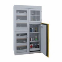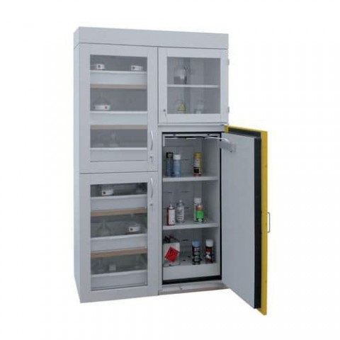 Bezpečné a předpisové skladování agresivních i hořlavých látek (90 minut, speciální protipožární oddíl) na pracovištích podle EN 14470-1 a TRGS 510. Vnější a vnitřní konstrukce skříně v barvě RAL 7035. Varianta skříně: žluté dveře RAL 1007. Konstrukce skříně z HPL desek. Izolace dle DIN 4102. Samostatně uzamykatelné oddíly cylindrickým zámkem pro skladování různých typů kapalin. Přípojka na odvětrávací systém DN 80 v horní části skříně. Výškově nastavitelné police v rastru 64 mm. Provoz dle TRGS 510 (schválené použití i bez napojení na odsávání vzduchu). Uzemnění ve shodě s TRBS 2153. Značení podle EN DIN EN 14470-1 / TRGS 510 / ISO 3864 / ASR A1.3.Bezpečnostní skříně na agresivní látky, jedy a hořlaviny KOMBILAB StoreLAB, 90 minut, 1200 KL3 GL