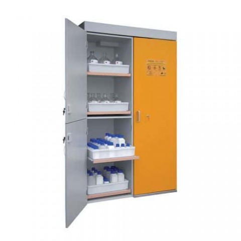 Bezpečné a předpisové skladování agresivních i hořlavých látek (90 minut, speciální protipožární oddíl) na pracovištích podle EN 14470-1 a TRGS 510. Vnější konstrukce skříně z ocelového plechu práškově lakovaného šedou RAL 7035, vnitřní konstrukce z HPL desek (Izolace dle DIN 4102), základna skříně z nerezého plechu (Niro Rhombus). Samostatně uzamykatelné oddíly cylindrickým zámkem pro skladování různých typů kapalin. Přípojka na odvětrávací systém DN 80 v horní části skříně. Výškově nastavitelné police v rastru 64 mm. Provoz dle TRGS 510 (schválené použití i bez napojení na odsávání vzduchu). Uzemnění ve shodě s TRBS 2153. Značení podle EN DIN EN 14470-1 / TRGS 510 / ISO 3864 / ASR A1.3. Možnost vyrovnání drobných nerovností podlahy rektifikačními šrouby.Bezpečnostní skříně na agresivní látky, jedy i hořlaviny KOMBILAB StoreLAB TYP 90, 90 minut, 4 police