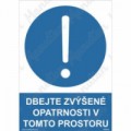 Bezpečnostní značka, tabulka nebo samolepka "Dbejte zvýšené opatrnosti v tomto prostoru" je tištěna na vysoce kvalitním materiálu, barvami s vysokou odolností proti otěru a UV záření. Provedení plně odpovídá požadavkům právních a technických předpisů, zejména Nařízení vlády č. 375/2017 Sb., ČSN ISO 3864-1, ČSN ISO 3864-2, ČSN ISO 3864-3, ČSN ISO 3864-4.Příkazové tabulky - Dbejte zvýšené opatrnosti v tomto prostoru