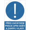 Značky, tabulky a samolepky "Před začátkem práce upni oděv a zakryj vlasy" tiskneme na velmi kvalitním materiálu, barvami s vysokou odolností proti otěru a UV záření. Tak, aby provedení značení bylo plně v souladu s Nařízením vlády č. 375/2017 Sb., ČSN ISO 3864 a ČSN ISO 3864-1.Příkazové tabulky - Před začátkem práce upni oděv a zakryj vlasy