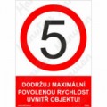 Bezpečnostní značení tabulkou, značkou nebo samolepkou "Dodržuj maximální povolenou rychlost uvnitř objektu" je tištěno na vysoce kvalitním materiálu, barvami s vysokou odolností proti otěru a UV záření. Provedení je plně v souladu s požadavky právních a technických předpisů, zejména Nařízení vlády č. 375/2017 Sb., ČSN ISO 3864-1, ČSN ISO 3864-2, ČSN ISO 3864-3, ČSN ISO 3864-4. Používá se k označení objektů, v kterých je z bezpečnostních důvodů nutné dodržovat maximální povolenou rychlost.Příkazové tabulky - Dodržuj maximální povolenou rychlost uvnitř objektu