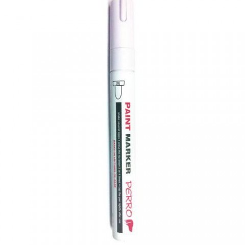 Lakový popisovač v bílé barvě s kuličkou pro promíchávání barvy.Bílé lakové popisovače