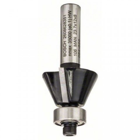 K ohraňování hran na pravidelných nebo vykružovaných obrobcích. S náběhovým kuličkovým ložiskem pro snadné vedení přímo na obrobku bez šablony. Fazetovací fréza pro jemné ozdobné fazety na nábytku. K zarovnávání a ohraňování deskových materiálů s povrchovou vrstvou, dřevěných trámů a hranových lišt při výrobě nábytku a zařizování obchodů. Hodí se na stavební prvky z dřevěných materiálů s povrchovou vrstvou, masivní dřevo nebo deskové materiály balení: 1 x BAL, 1ks v BAL o: 23,7 mm celková délka: 54 mm délka: 12 mm o stopky: 8 mmBosch - Fazetová/hranová fréza 8 mm, D1 23,7 mm, B 5,5 mm, L 12 mm, G 54 mm, 25°