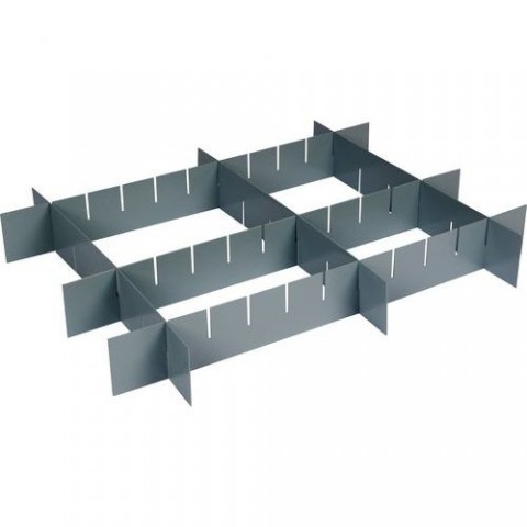 Sada 6 ks dělících příček k organizaci místa v zásuvkách o výšce 72 mm montážního vozíku díky možnosti rozdělení zásuvkových prostor na jednotlivé přihrádky. Sada příček je použitelná vždy na jednu zásuvku. Materiál: ocelový plech tl. 1 mm Typ: 3 příčné, 3 podélné Délka (cm): 49,6; 38,2 Barva: šedá RAL 7001Dělicí příčky