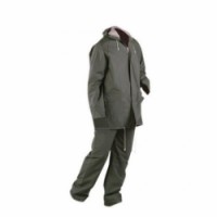 Nepromokavá souprava bundy a kalhot s dvojitou povrchovou úpravou (bavlněný podklad z PVC a polyesteru). Zadní část bundy je odvětrávaná, zapíná se na zip, má klopu proti bouři se zapínáním na patentky a stahovací šňůrku ve spodní části. Kapuce s límcem: pevná kapuce se stahovací šňůrkou. Rukáv s utahováním větrovky. Kalhoty se zapínáním na patentky a stahováním (guma v pase, patentky na nohavicích).Dešťová souprava z PVC