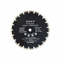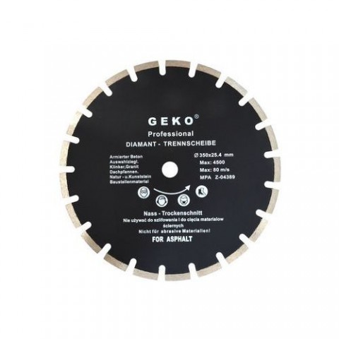 Kvalitní diamantový segmentový řezný kotouč GEKO s rozměry 350 x 10 X 25,4 mm vhodný pro hluboké řezání tvrdých stavebních materiálů za mokra i za sucha. s přerušovaným diamantovým segmentem po celém obvodu (s drážkami, výřezy), který je rozdělený na určitý počet užších segmentů. Tyto výřezy kotouč během řezání chladí a vynáší obroušený materiál z řezu ven. Segmentový kotouč se hodí pro hluboké řezání tvrdých stavebních materiálů jako je např. beton, železobeton, asfalt, zdivo, kámen apod., vytváří širší řez a může štípat okraje.Diamantový řezný kotouč na asfalt, 350x25,4mm GEKO
