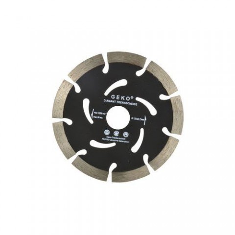 Kvalitní diamantový segmentový řezný kotouč GEKO s rozměry 125 x 22,2 x 10 mm vhodný pro hluboké řezání tvrdých stavebních materiálů za mokra i za sucha. s přerušovaným diamantovým segmentem po celém obvodu (s drážkami, výřezy), který je rozdělený na určitý počet užších segmentů. Tyto výřezy kotouč během řezání chladí a vynáší obroušený materiál z řezu ven. Segmentový kotouč se hodí pro hluboké řezání tvrdých stavebních materiálů jako je např. beton, železobeton, asfalt, zdivo, kámen apod., vytváří širší řez a může štípat okraje.Diamantový řezný kotouč, segmentový, 125x22,2x10mm GEKO