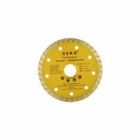 Kvalitní diamantový řezný kotouč turbo GEKO s rozměry 115 x 22 mm vhodný pro hluboké řezání tvrdých stavebních materiálů za sucha i mokra. S nepřerušovaným diamantovým segmentem a prolamováním po celém obvodu. Díky prolamování turbo kotouč chladí lépe jak obyčejný celoobvodový, lépe vynáší obroušený materiál z řezu ven a řezání je rychlejší, avšak může docházet ke štípání hran a výsledný řez je širší. Turbo kotouč se hodí pro hluboké řezání tvrdých stavebních materiálů jako je např. beton, zdivo, kámen, zámkový dlažba apod.Diamantový řezný kotouč, TURBO, 115x22mm GEKO