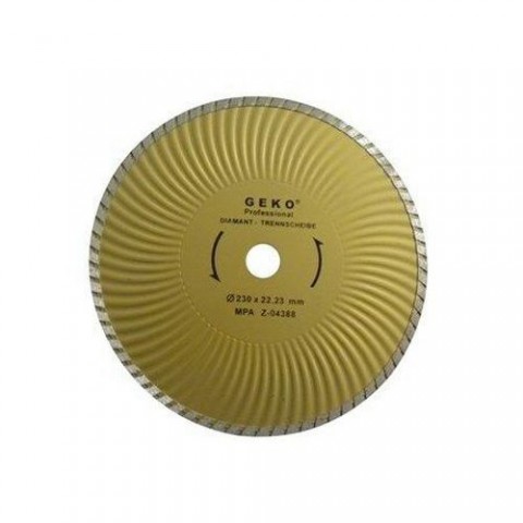 Kvalitní diamantový řezný kotouč turbo GEKO s rozměry 230 x 22 mm vhodný pro hluboké řezání tvrdých stavebních materiálů za sucha i mokra. S nepřerušovaným diamantovým segmentem a prolamováním po celém obvodu. Díky prolamování turbo kotouč chladí lépe jak obyčejný celoobvodový, lépe vynáší obroušený materiál z řezu ven a řezání je rychlejší, avšak může docházet ke štípání hran a výsledný řez je širší. Turbo kotouč se hodí pro hluboké řezání tvrdých stavebních materiálů jako je např. beton, zdivo, kámen, zámkový dlažba apod.Diamantový řezný kotouč, TURBO PLUS, 230x22mm GEKO