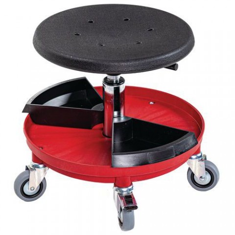 Mobilní montážní židle pro práci. Veškeré nářadí máte vždy po ruce ve dvou přihrádkách na nářadí. Snadno nastavíte výšku sezení. S 5 kolečky, z toho 2 s brzdou.Dílenská stolička s kolečky
