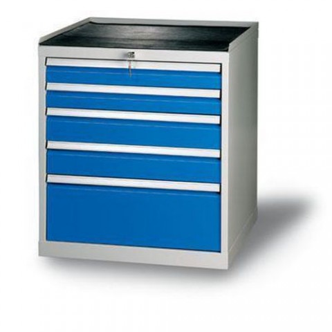 Dílenská skříň s pěti zásuvkami a s povrchovou úpravou práškovým lakem slouží pro uložení nářadí, nástrojů a materiálu na pracovištích. Konstrukce zásuvkové skříně je vyrobena z ocelového plechu. Zásuvky skříňky jsou opatřeny masivním ložiskovým výsuvem a popisovými lištami na své přední části. Centrální uzamykání cylindrickým zámkem s blokací vysunutí více zásuvek najednou. Horní odkládací plocha z rýhované gumy s rámem zamezujícím pádu nářadí. výška zásuvky: 2 x 9; 2 x 12; 1 x 24 cm výsuv zásuvek: 75 %Dílenská zásuvková skříň, 84 x 72 x 70 cm, 5 zásuvek