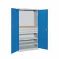 Dílenské skříně se dvěma policemi a dvěma zásuvkami jsou vyrobeny z ocelového plechu, tl.1 mm. Zadní část kovových skříní i dveře jsou opatřeny perforovanými panely pro uchycení držáku nářadí a boxů. Plechové skříně je možné uzamknout cylindrickým dvoubodovým rozvorovým zámkem. Úhel otevření dveří je 110°.Kovové dílenské skříně, 195 x 95 x 60 cm