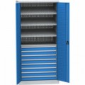 Dílenské skříně se dvěma policemi a čtyřmi zásuvkami jsou vyrobeny z ocelového plechu, tl.1 mm. Zadní část kovových skříní i dveře jsou opatřeny perforovanými panely pro uchycení držáku nářadí a boxů. Plechové skříně je možné uzamknout cylindrickým dvoubodovým rozvorovým zámkem. Úhel otevření dveří je 110°.Kovové dílenské skříně, 195 x 95 x 60 cm