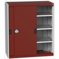 Kovové dílenské skříně s posuvnými dveřmi jsou vhodné do míst s omezeným prostorem. Posuvné dveře včetně madel a zámku. Pozinkované police s nosností 100kg, výškově nastavitelné v rastru 25 mm. Svařovaná ocelová konstrukce, povrchová úprava práškovým lakem.Dílenské skříně s posuvnými dveřmi Bott Cubio, výška 120 cm