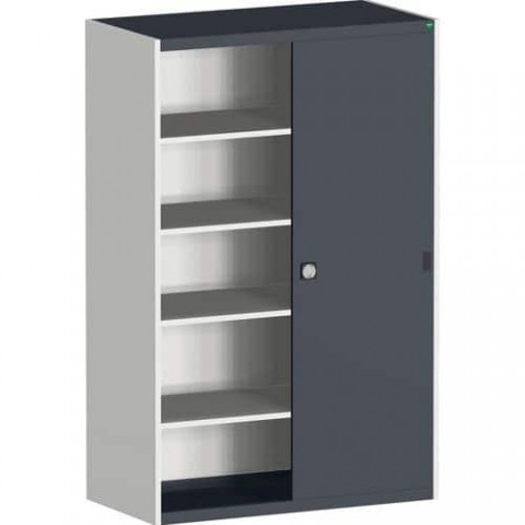 Kovové dílenské skříně s posuvnými dveřmi jsou vhodné do míst s omezeným prostorem. Posuvné dveře včetně madel a zámku. Pozinkované police s nosností 100kg, výškově nastavitelné v rastru 25 mm. Svařovaná ocelová konstrukce, povrchová úprava práškovým lakem.Dílenské skříně s posuvnými dveřmi Bott Cubio, výška 200 cm