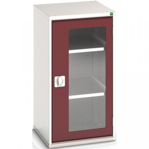 Kovové dílenské skříně s průhlednými plexi dveřmi pro snadnou kontrolu obsahu. Pozinkované police s nosností 75 kg, výškově nastavitelné v rastru 25 mm. Svařovaná ocelová konstrukce, povrchová úprava práškovým lakem. Uzamykání tříbodovým cylindrickým rozvorovým zámkem se dvěma klíči.Dílenské skříně s průhlednými dveřmi Bott Verso, výška 100 cm