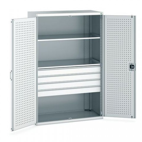 Kovové dílenské skříně vybaveny policemi s nosností 160 kg a zásuvkami pro efektivní využití v provozech a dílnách. Robustní svařovaná ocelová konstrukce s nosností až 1,5 tuny, povrchová úprava práškovým lakem. Vyztužené křídlové dveře s perforovanou vnitřní stranou pro uložení nářadí. Tříbodový cylindrický rozvorový zámek se dvěma klíči. Pozinkované police výškově nastavitelné v rastru 25 mm. Zásuvky s nosností 75 kg a 100% výsuvem na válečkových ložiskách.Dílenské skříně se zásuvkami Bott Cubio 160, výška 200 cm