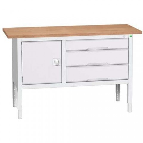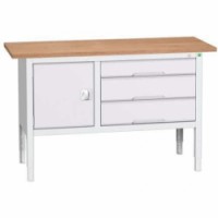 Dílenské stoly Bott Verso Storage s nastavitelnou výškou v rozsahu 83 až 93 cm. Pracovní deska tloušťky 3 mm typu multiplex, pozinkovaná police s nosností 75 kg, výškově nastavitelná. Centrálně uzamykatelné zásuvky s nosností 75 kg, výškami 12,5 a 17,5 cm a 100% výsuvem na válečkových ložiskách. Uzamykatelné skříňky (výška dveří 50 nebo 35 cm), uvnitř pozinkovaná výškově nastavitelná police s nosností 75 kg. Svařovaná ocelová konstrukce, povrchová úprava práškovým lakem.Dílenské stoly Bott Verso Storage, 83-93 x 150 x 60 cm, různá vybavení, multiplex