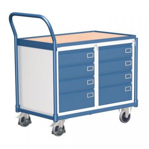 Dílenský vozík je rozdělen na dva zásuvkové kontejnery, na kterých se nachází odkládací prostor. Manipulace s vozíkem na dvou pevných a dvou otočných kolečkách s brzdou pomocí praktického madla. S Jednotlivé kontejnery jsou centrálně uzamykatelné a skládají se ze čtyřech zásuvek uložených na kuličkových výsuvech. Odkládací prostory jsou ohraničeny L - profilem, ve kterých jsou usazeny MDF desky.Dílenské vozíky s 8 zásuvkami, 101 x 112,5 x 62,5 cm