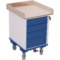 Dílenský vozík se čtyřmi zásuvkami a s pracovní plochou z bukové překližky, která je opatřená vyvýšenou hranou 80 mm. Zásuvky se štítkem pro označení, centrální uzamykání cylindrickým zámkem. Maximální nosnost zásuvky je 25 kg. Šedá kola z termoplastické pryže nezanechávající stopy na plastovém ráfku s přesnými kuličkovými ložisky. Dvě pevná a dvě otočná kola s brzdou EasySTOP.Dílenské vozíky se 4 zásuvkami, vyvýšené okraje, 57,5 x 66 x 90,5 cm
