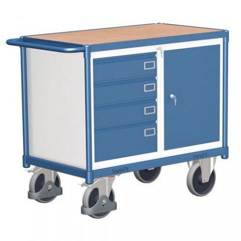 Dílenský vozík je vybaven skříňkou se dvěma vyndavacími policemi a zásuvkovou skříňkou se čtyřmi zásuvkami. Obě plechové skříňky jsou centrálně uzamykatelné cylindrickým zámkem. Mobilitu dílenského vozíku zajišťují dvě pevná a dvě otočná pryžová kola s brzdou.Dílenské vozíky se skříňkou a 4 zásuvkami, 93 x 119 x 60 cm