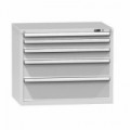 Zásuvková skříň je opatřená mechanismem centrálního zamykání a blokace zásuvek. Zásuvky jsou základním skladovacím prvkem, a proto splňují vysoké požadavky na pevnost a stabilitu. Korpusy zásuvkových skříní tvoří svařenec jednotliv??ch konstrukčních dílů z kvalitních ocelových plechů. Vnitřní konstrukce korpusů je opatřena perforací po 25 mm. Tuto perforaci využíváme k uchycení vodicích lišt zásuvek, jejich výškovému uspořádání a nakonfigurování požadované zásuvkové sestavy. Přestavování vodicích lišt nebo háčků polic probíhá jednoduše a velice rychle bez použití nástrojů.Zásuvkové skříně ZE5, 578 x 753 x 990 mm