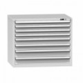 Zásuvková skříň je opatřená mechanismem centrálního zamykání a blokace zásuvek. Zásuvky jsou základním skladovacím prvkem, a proto splňují vysoké požadavky na pevnost a stabilitu. Korpusy zásuvkových skříní tvoří svařenec jednotlivých konstrukčních dílů z kvalitních ocelových plechů. Vnitřní konstrukce korpusů je opatřena perforací po 25 mm. Tuto perforaci využíváme k uchycení vodicích lišt zásuvek, jejich výškovému uspořádání a nakonfigurování požadované zásuvkové sestavy. Přestavování vodicích lišt nebo háčků polic probíhá jednoduše a velice rychle bez použití nástrojů.Zásuvkové skříně ZG1, 1037 x 753 x 1215 mm
