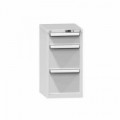 Zásuvková skříň je opatřená mechanismem centrálního zamykání a blokace zásuvek. Zásuvky jsou základním skladovacím prvkem, a proto splňují vysoké požadavky na pevnost a stabilitu. Korpusy zásuvkových skříní tvoří svařenec jednotlivých konstrukčních dílů z kvalitních ocelových plechů. Vnitřní konstrukce korpusů je opatřena perforací po 25 mm. Tuto perforaci využíváme k uchycení vodicích lišt zásuvek, jejich výškovému uspořádání a nakonfigurování požadované zásuvkové sestavy. Přestavování vodicích lišt nebo háčků polic probíhá jednoduše a velice rychle bez použití nástrojů.Zásuvkové skříně ZH3, 442 x 753 x 990 mm