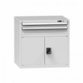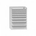 Zásuvková skříň je opatřená mechanismem centrálního zamykání a blokace zásuvek. Zásuvky jsou základním skladovacím prvkem, a proto splňují vysoké požadavky na pevnost a stabilitu. Korpusy zásuvkových skříní tvoří svařenec jednotlivých konstrukčních dílů z kvalitních ocelových plechů. Vnitřní konstrukce korpusů je opatřena perforací po 25 mm. Tuto perforaci využíváme k uchycení vodicích lišt zásuvek, jejich výškovému uspořádání a nakonfigurování požadované zásuvkové sestavy. Přestavování vodicích lišt nebo háčků polic probíhá jednoduše a velice rychle bez použití nástrojů.Zásuvkové skříně ZL8, 442 x 600 x 840 mm
