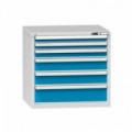 Zásuvková skříň je opatřená mechanismem centrálního zamykání a blokace zásuvek. Zásuvky jsou základním skladovacím prvkem, a proto splňují vysoké požadavky na pevnost a stabilitu. Korpusy zásuvkových skříní tvoří svařenec jednotlivých konstrukčních dílů z kvalitních ocelových plechů. Vnitřní konstrukce korpusů je opatřena perforací po 25 mm. Tuto perforaci využíváme k uchycení vodicích lišt zásuvek, jejich výškovému uspořádání a nakonfigurování požadované zásuvkové sestavy. Přestavování vodicích lišt nebo háčků polic probíhá jednoduše a velice rychle bez použití nástrojů.Zásuvkové skříně ZK6, 884 x 753 x 990 mm