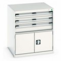 Zásuvkové skříně Bott Cubio se zásuvkami s nosností 200 kg a 100% výsuvy na válečkových ložiskách. Robustní svařovaná ocelová konstrukce s nosností až 1,5 tuny, povrchová úprava práškovým lakem. Systém centrálního zámku i blokace otevření více zásuvek najednou. Ergonomické rukojeti s popisovatelnou lištou, uzamykání cylindrickým zámkem se dvěma klíči.Dílenské zásuvkové skříně Bott Cubio 200, 90 x 80 x 65-75 cm, 3 zásuvky, 1 skříňka