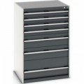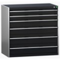 Zásuvkové skříně Bott Cubio se zásuvkami s nosností 200 kg a 100% výsuvy na válečkových ložiskách. Robustní svařovaná ocelová konstrukce s nosností až 1,5 tuny, povrchová úprava práškovým lakem. Systém centrálního zámku i blokace otevření více zásuvek najednou. Ergonomické rukojeti s popisovatelnou lištou, uzamykání cylindrickým zámkem se dvěma klíči.Dílenské zásuvkové skříně Bott Cubio 200, 100 x 80 x 65-75 cm, 7 zásuvek