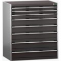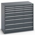 Zásuvkové skříně Bott Cubio se zásuvkami s nosností 75 kg a 100% výsuvy na válečkových ložiskách. Robustní svařovaná ocelová konstrukce s nosností až 1,5 tuny, povrchová úprava práškovým lakem. Systém centrálního zámku i blokace otevření více zásuvek najednou. Ergonomické rukojeti s popisovatelnou lištou, uzamykání cylindrickým zámkem se dvěma klíči.Dílenské zásuvkové skříně Bott Cubio, 100 x 105 x 65-75 cm, 8 zásuvek