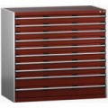 Zásuvkové skříně Bott Cubio se zásuvkami s nosností 200 kg a 100% výsuvy na válečkových ložiskách. Robustní svařovaná ocelová konstrukce s nosností až 1,5 tuny, povrchová úprava práškovým lakem. Systém centrálního zámku i blokace otevření více zásuvek najednou. Ergonomické rukojeti s popisovatelnou lištou, uzamykání cylindrickým zámkem se dvěma klíči.Dílenské zásuvkové skříně Bott Cubio 200, 120 x 130 x 65-75 cm, 10 zásuvek