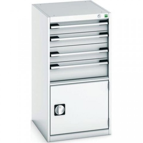 Zásuvkové skříně Bott Cubio se zásuvkami s nosností 75 kg a 100% výsuvy na válečkových ložiskách. Dvířka skříňky s perforovanou vnitřní stranou pro uložení nářadí. Robustní svařovaná ocelová konstrukce s nosností až 1,5 tuny, povrchová úprava práškovým lakem. Systém centrálního zámku i blokace otevření více zásuvek najednou. Ergonomické rukojeti s popisovatelnou lištou, uzamykání cylindrickým zámkem se dvěma klíči.Dílenské zásuvkové skříně Bott Cubio, 100 x 52,5 x 52,5-65 cm, 4 zásuvky, 1 skříňka