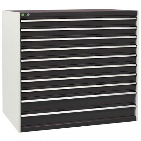 Zásuvkové skříně Bott Cubio se zásuvkami s nosností 75 kg a 100% výsuvy na válečkových ložiskách. Robustní svařovaná ocelová konstrukce s nosností až 1,5 tuny, povrchová úprava práškovým lakem. Systém centrálního zámku i blokace otevření více zásuvek najednou. Ergonomické rukojeti s popisovatelnou lištou, uzamykání cylindrickým zámkem se dvěma klíči.Dílenské zásuvkové skříně Bott Cubio, 120 x 130 x 65-75 cm, 10 zásuvek