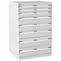 Zásuvkové skříně Bott Cubio se zásuvkami s nosností 75 kg a 100% výsuvy na válečkových ložiskách. Robustní svařovaná ocelová konstrukce s nosností až 1,5 tuny, povrchová úprava práškovým lakem. Systém centrálního zámku i blokace otevření více zásuvek najednou. Ergonomické rukojeti s popisovatelnou lištou, uzamykání cylindrickým zámkem se dvěma klíči.Dílenské zásuvkové skříně Bott Cubio, 120 x 80 x 52,5-75 cm, 8 zásuvek