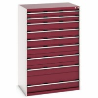 Zásuvkové skříně Bott Cubio se zásuvkami s nosností 75 kg a 100% výsuvy na válečkových ložiskách. Robustní svařovaná ocelová konstrukce s nosností až 1,5 tuny, povrchová úprava práškovým lakem. Systém centrálního zámku i blokace otevření více zásuvek najednou. Ergonomické rukojeti s popisovatelnou lištou, uzamykání cylindrickým zámkem se dvěma klíči.Dílenské zásuvkové skříně Bott Cubio, 160 x 105 x 65-75 cm, 9 zásuvek