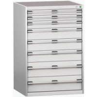 Zásuvkové skříně Bott Cubio se zásuvkami s nosností 200 kg a 100% výsuvy na válečkových ložiskách. Robustní svařovaná ocelová konstrukce s nosností až 1,5 tuny, povrchová úprava práškovým lakem. Systém centrálního zámku i blokace otevření více zásuvek najednou. Ergonomické rukojeti s popisovatelnou lištou, uzamykání cylindrickým zámkem se dvěma klíči.Dílenské zásuvkové skříně Bott Cubio 200, 120 x 80 x 65-75 cm, 8 zásuvek