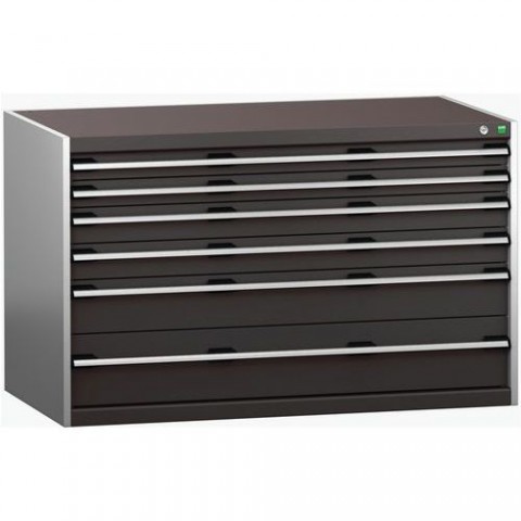 Zásuvkové skříně Bott Cubio se zásuvkami s nosností 200 kg a 100% výsuvy na válečkových ložiskách. Robustní svařovaná ocelová konstrukce s nosností až 1,5 tuny, povrchová úprava práškovým lakem. Systém centrálního zámku i blokace otevření více zásuvek najednou. Ergonomické rukojeti s popisovatelnou lištou, uzamykání cylindrickým zámkem se dvěma klíči.Dílenské zásuvkové skříně Bott Cubio 200, 80 x 130 x 65-75 cm, 6 zásuvek