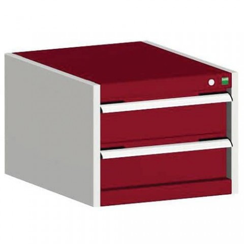 Zásuvkové skříně Bott Cubio se zásuvkami s nosností 75 kg a 100% výsuvy na válečkových ložiskách. Robustní svařovaná ocelová konstrukce s nosností až 1,5 tuny, povrchová úprava práškovým lakem. Systém centrálního zámku i blokace otevření více zásuvek najednou. Ergonomické rukojeti s popisovatelnou lištou, uzamykání cylindrickým zámkem se dvěma klíči.Dílenské zásuvkové skříně Bott Cubio, 40 x 52,5 x 52,5-65 cm, 2 zásuvky