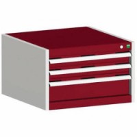 Zásuvkové skříně Bott Cubio se zásuvkami s nosností 75 kg a 100% výsuvy na válečkových ložiskách. Robustní svařovaná ocelová konstrukce s nosností až 1,5 tuny, povrchová úprava práškovým lakem. Systém centrálního zámku i blokace otevření více zásuvek najednou. Ergonomické rukojeti s popisovatelnou lištou, uzamykání cylindrickým zámkem se dvěma klíči.Dílenské zásuvkové skříně Bott Cubio, 40 x 65 x 52,5-75 cm, 3 zásuvky