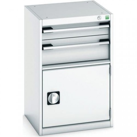 Zásuvkové skříně Bott Cubio se zásuvkami s nosností 75 kg a 100% výsuvy na válečkových ložiskách. Dvířka skříňky s perforovanou vnitřní stranou pro uložení nářadí. Robustní svařovaná ocelová konstrukce s nosností až 1,5 tuny, povrchová úprava práškovým lakem. Systém centrálního zámku i blokace otevření více zásuvek najednou. Ergonomické rukojeti s popisovatelnou lištou, uzamykání cylindrickým zámkem se dvěma klíči.Dílenské zásuvkové skříně Bott Cubio, 80 x 52,5 x 52,5-65 cm, 2 zásuvky, 1 skříňka