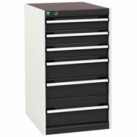 Zásuvkové skříně Bott Cubio se zásuvkami s nosností 75 kg a 100% výsuvy na válečkových ložiskách. Robustní svařovaná ocelová konstrukce s nosností až 1,5 tuny, povrchová úprava práškovým lakem. Systém centrálního zámku i blokace otevření více zásuvek najednou. Ergonomické rukojeti s popisovatelnou lištou, uzamykání cylindrickým zámkem se dvěma klíči.Dílenské zásuvkové skříně Bott Cubio, 90 x 52,5 x 52,5-65 cm, 6 zásuvek