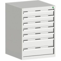 Zásuvkové skříně Bott Cubio se zásuvkami s nosností 75 kg a 100% výsuvy na válečkových ložiskách. Robustní svařovaná ocelová konstrukce s nosností až 1,5 tuny, povrchová úprava práškovým lakem. Systém centrálního zámku i blokace otevření více zásuvek najednou. Ergonomické rukojeti s popisovatelnou lištou, uzamykání cylindrickým zámkem se dvěma klíči.Dílenské zásuvkové skříně Bott Cubio, 90 x 65 x 52,5-75 cm, 7 zásuvek